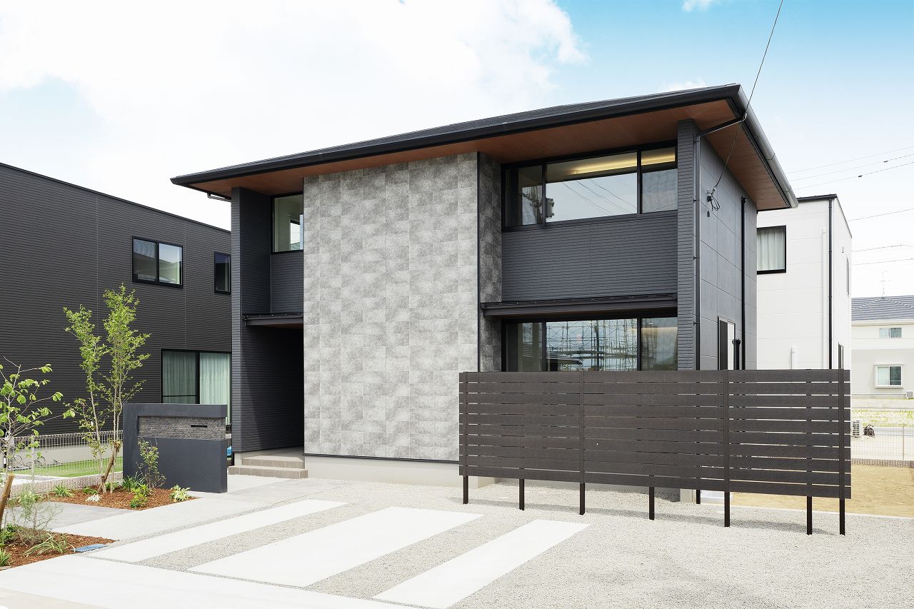 黒とグレーのモダンな外観、大きな窓が日差しをたっぷりと取り込む開放感あるお家!