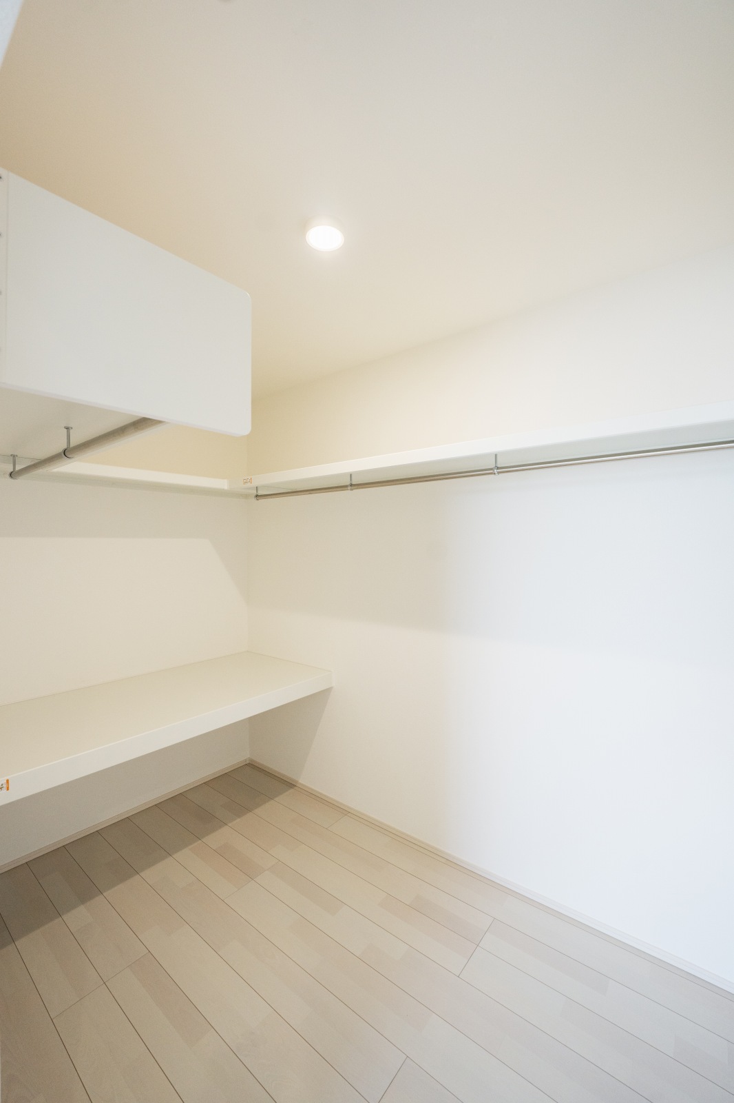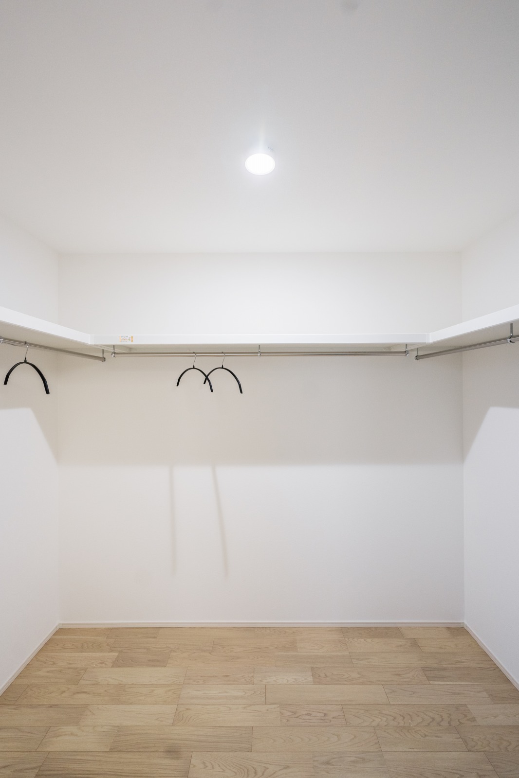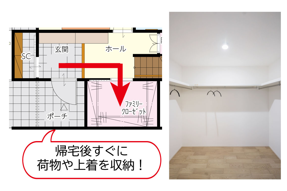 - 玄関ホールに直結のファミリークローゼット! 帰宅後すぐに荷物や上着をスッと収納でき、家族全員が使いやすい共有収納スペースです。