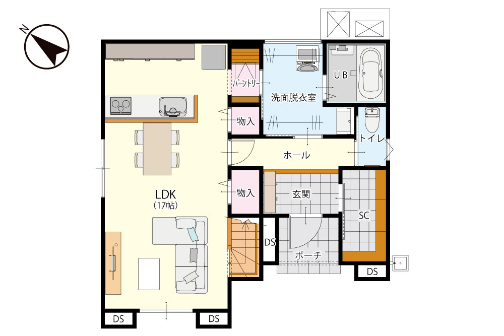 - キッチンからパントリー、洗面脱衣室へと一直線!家事がスイスイ進んで、自分と家族の大切な時間がもっと増える間取りです。