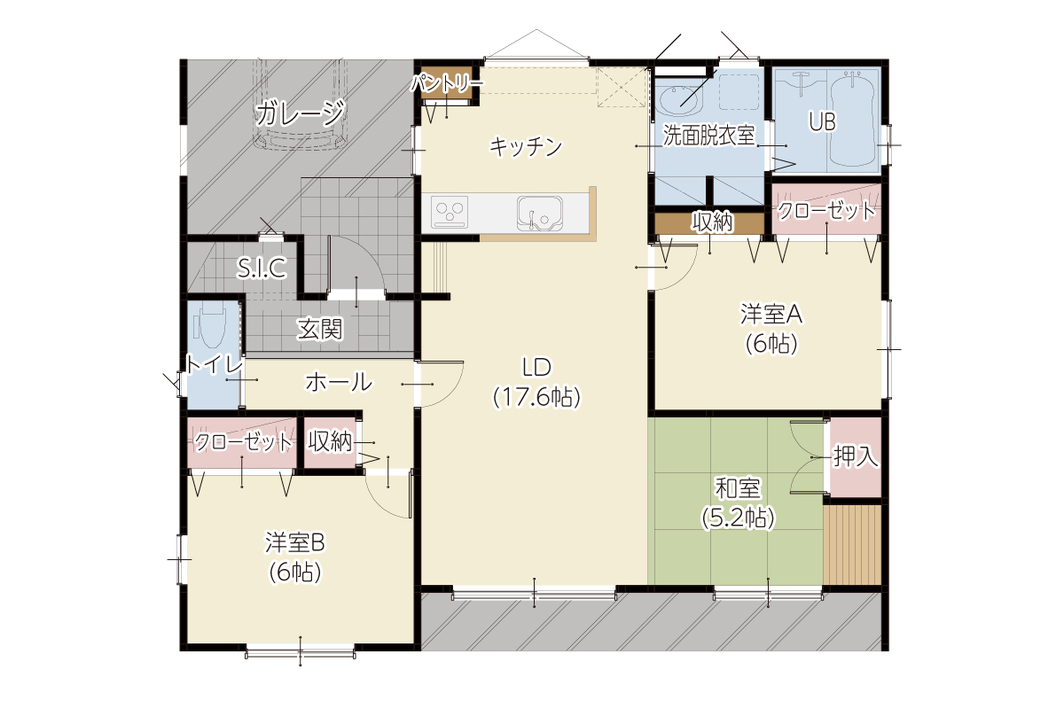 南の大きな窓から陽光がたっぷりと注ぐ17.6帖のLDK。家族が自然と集まり、健やかな毎日を育む住まいの中心です。