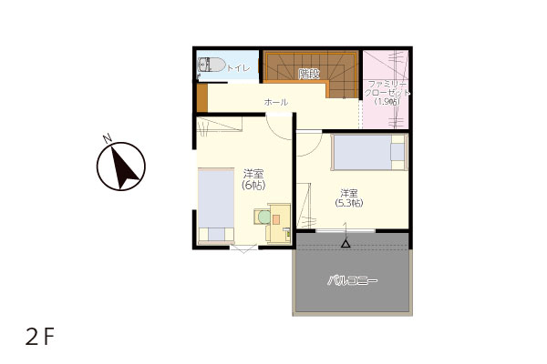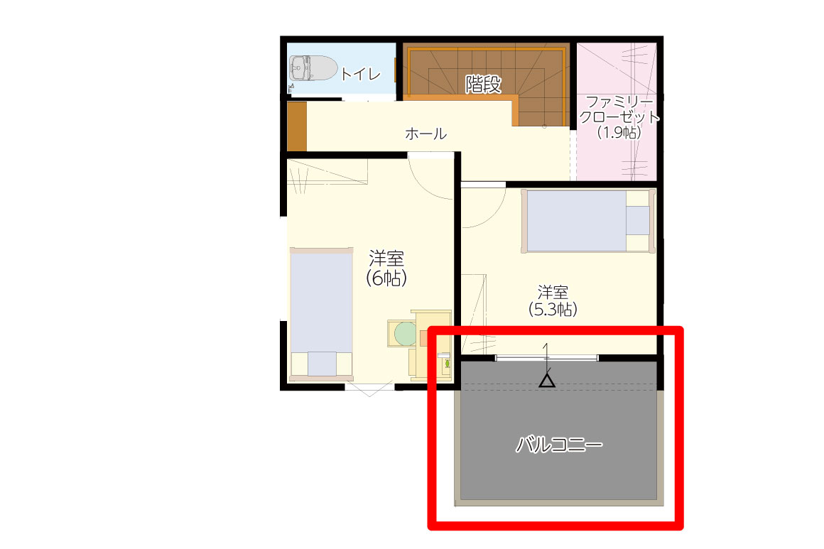 - 2階には子供部屋が2つ。家族で共有できる便利なファミリークローゼット。約5帖のバルコニーは洗濯物を干したり、プールを置いて遊んだり、使い方色々。