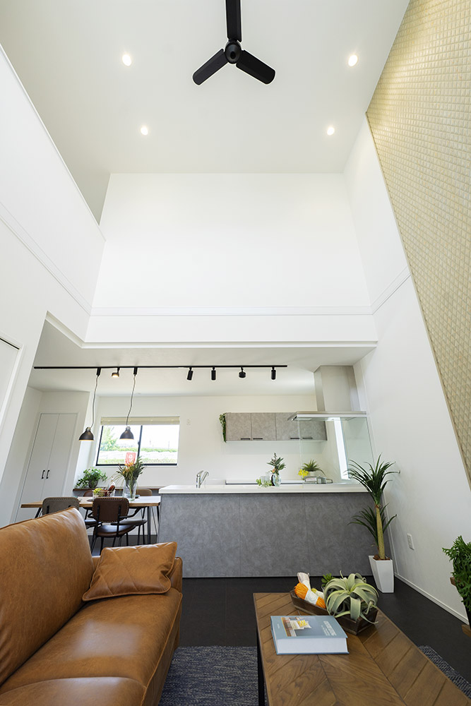 リビング吹抜け- 吹抜けから明るい陽射しが降り注ぐ、約18帖のLDK。