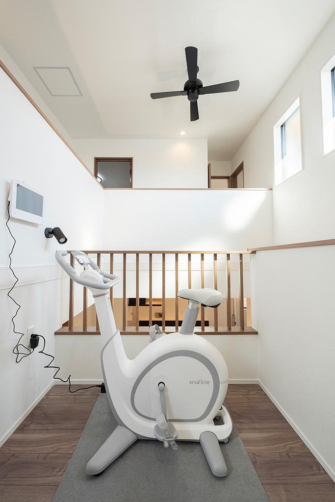 すきま時間も有効活用。いつでも、どこでも、心地よい運動が楽しめる。- 階段中腹のスキップフロアにフィットネスバイクを設置。ちょっとした「すきま時間」に、運動を楽しむことができます。