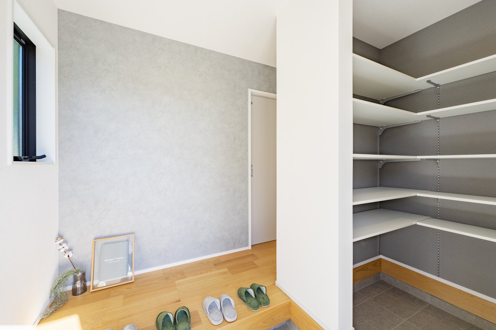 学校から帰ってきたら、ここに物を片付けて部屋の中に。小さなお子様でも自然と片付けの習慣がつきます。