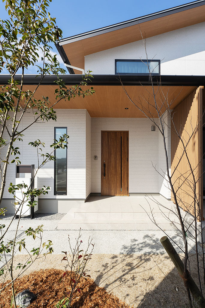 どこか懐かしい和の趣と現代的なデザインが融合した外観- どこか懐かしさを感じる「和」の要素を取り入れた外観。玄関近くのコートラインやバルコニーなど、現代的な様式も取り入れています。