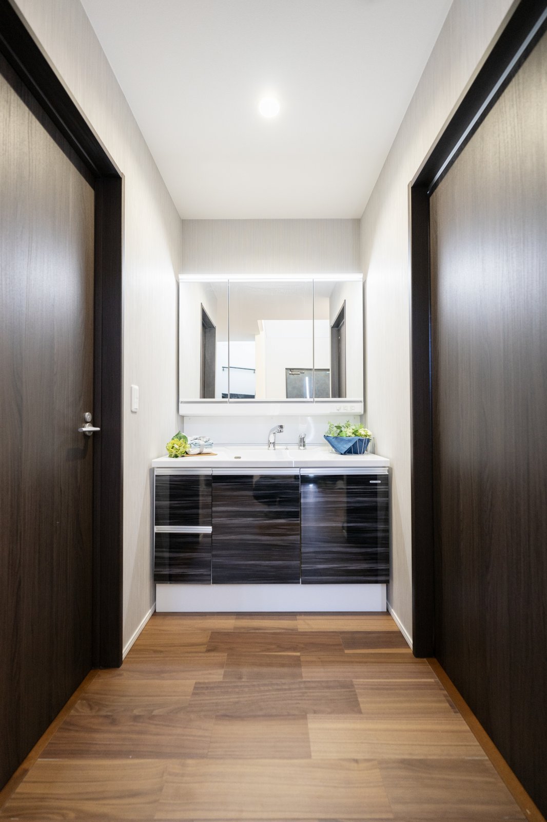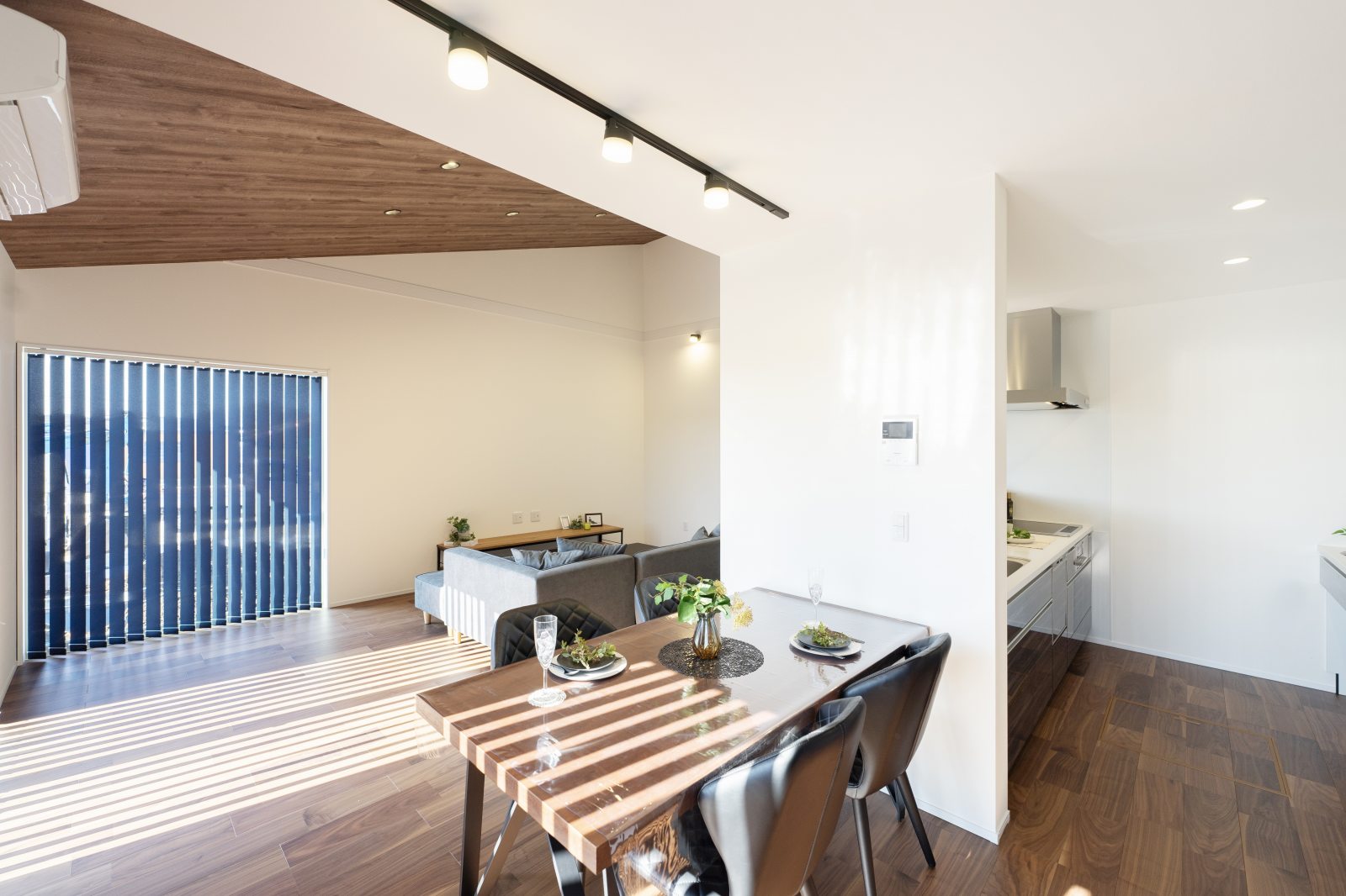 床材と建具が織りなす、重厚感と高級感あふれる洗練空間- ウォールナットの床材とダークカラーの建具が、重厚感ある洗練された雰囲気を演出。高級感と暖かみを併せ持ち、家族のくつろぎの時間をより豊かにします。