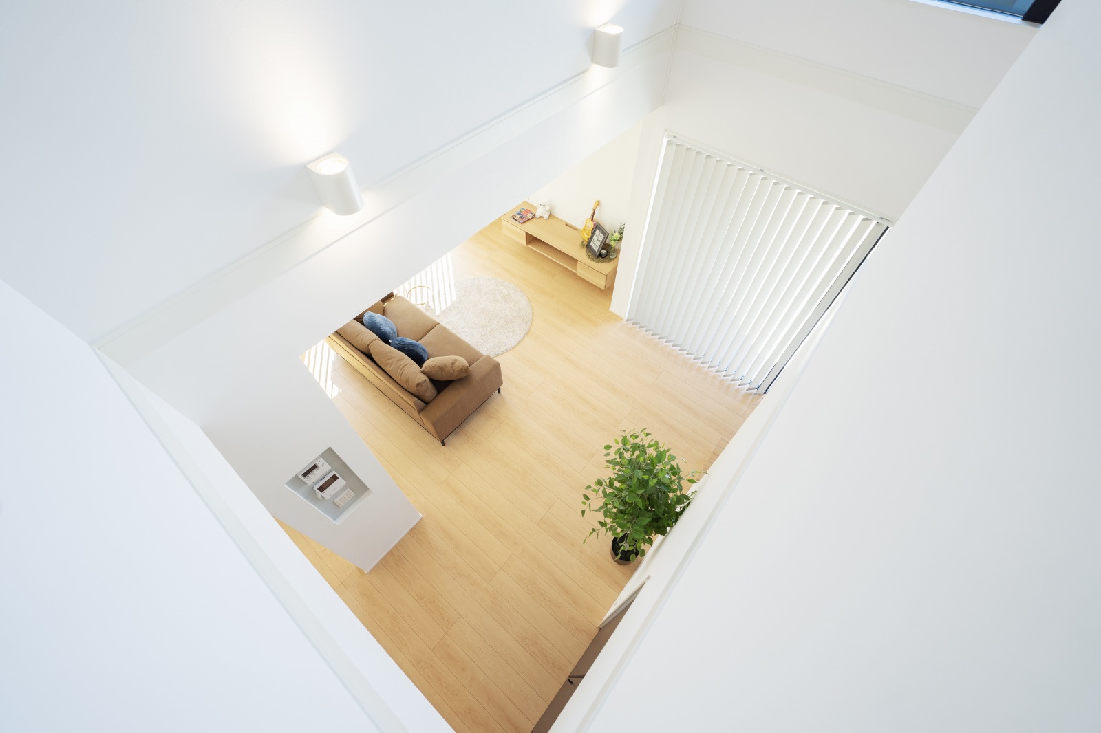 子供のスタディスペースやワークスペースに最適な2階カウンター- 2階ホールにカウンターと収納付きの書斎スペース。吹抜からリビングを見下ろせるので、家族の存在をほのかに感じながら作業に集中できます。