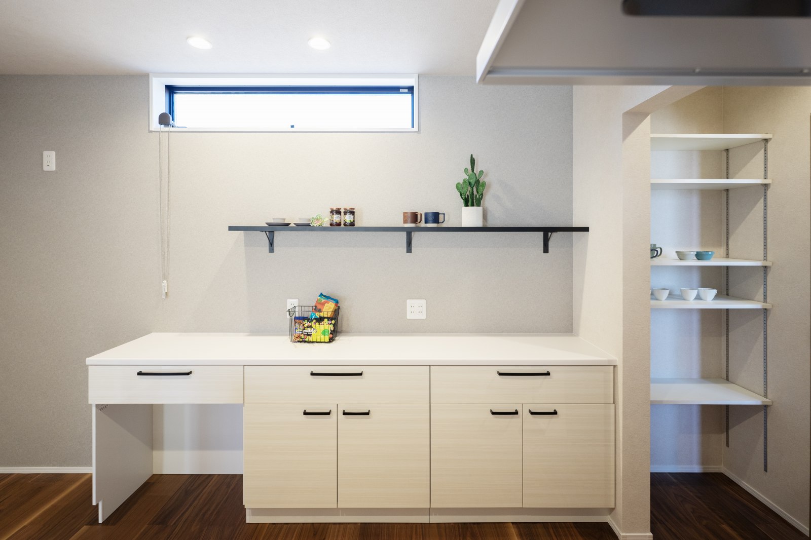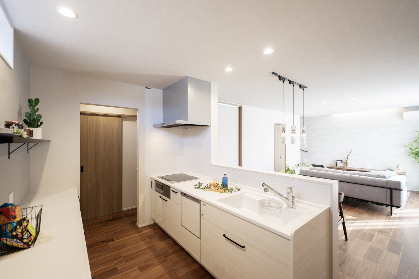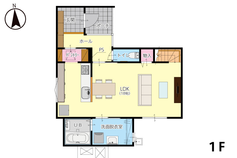 玄関からキッチンまで最短距離!- 玄関からキッチンへ一直線の間取り。お買い物帰りに冷蔵庫やパントリーへ運ぶ距離が短い、らくらく動線です。