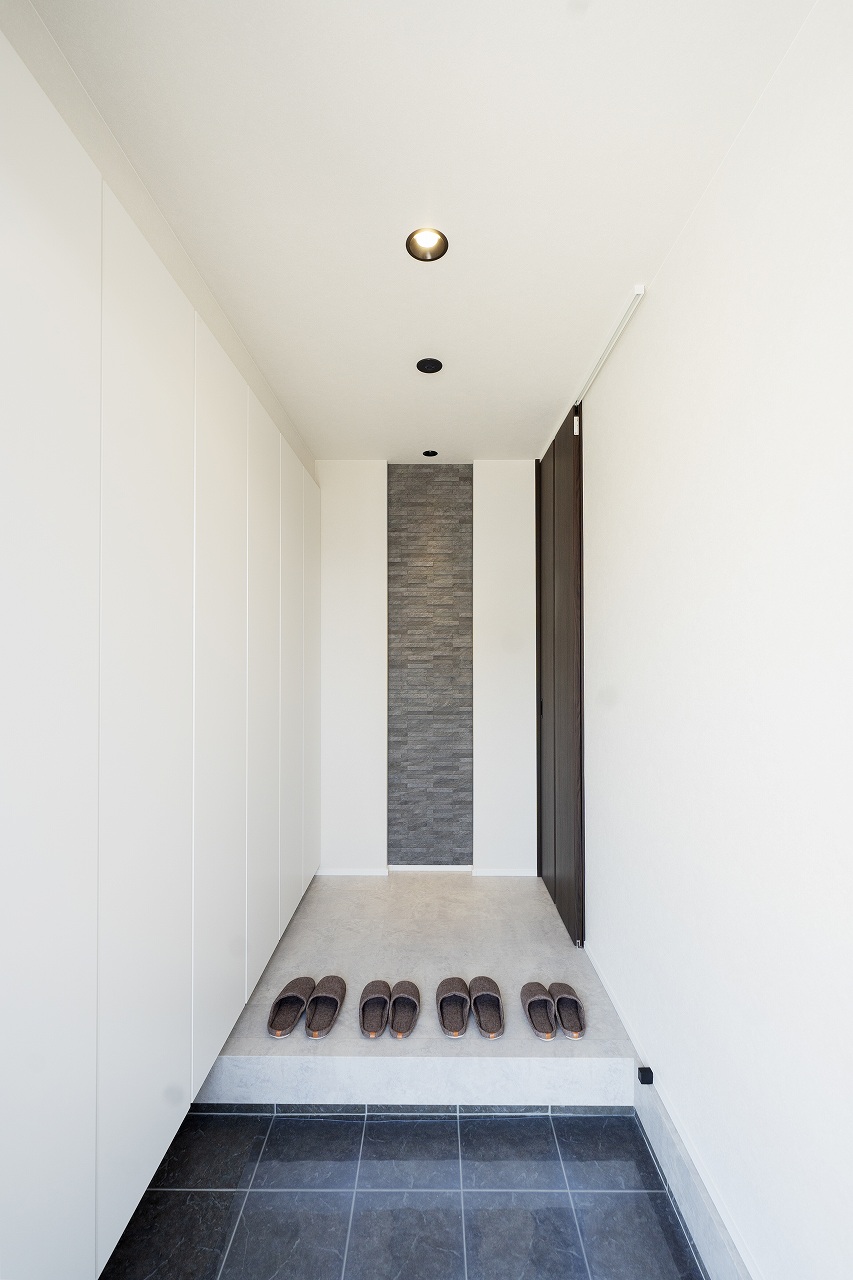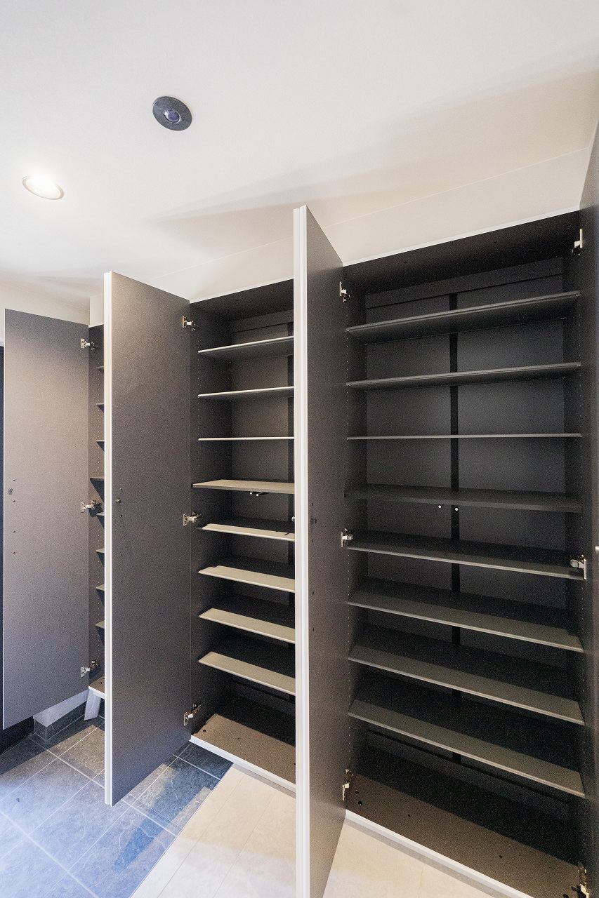 300足以上も収納可能なシューズクローク!- 玄関にある収納棚は大容量で、家族全員の靴がすっぽりと入るほどの広さなので、散らかることなくすっきりとした玄関を保つことができます。