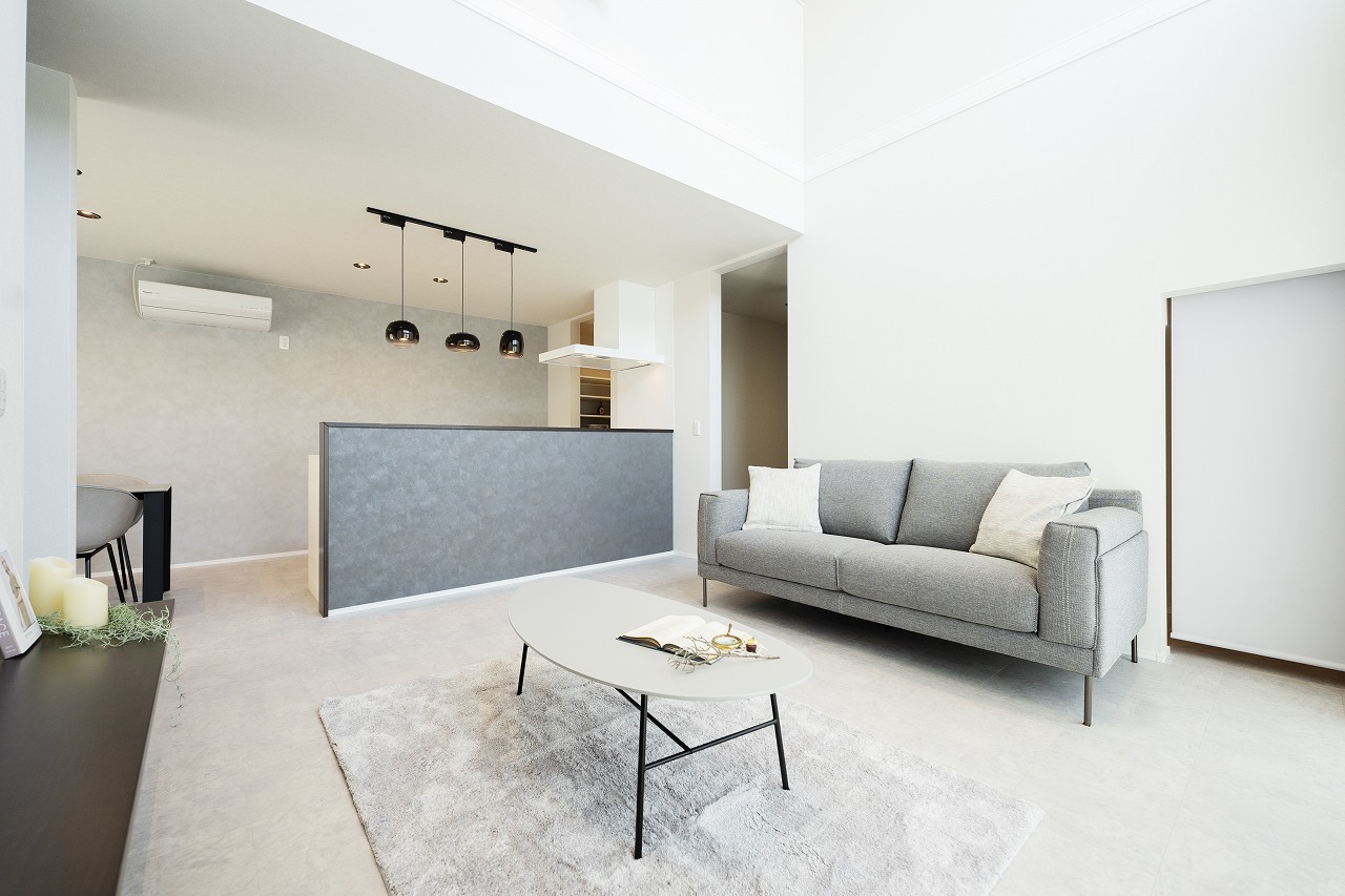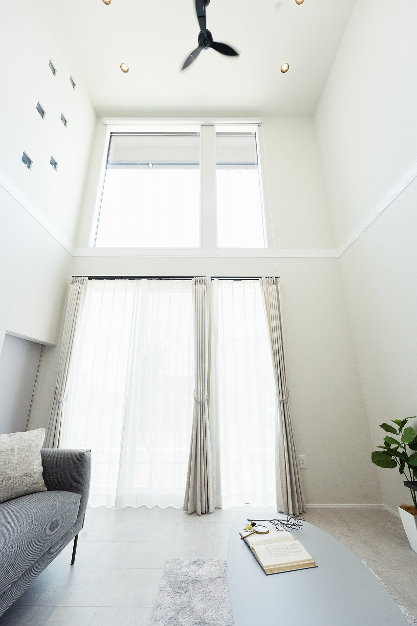 開放感100点の吹き抜け- 吹き抜けになっているリビング。1階と2階を吹き抜けでつなげることで、より解放感のある空間になります。また、吹き抜けは空気の循環を良くするため、家全体の通風性が向上します。