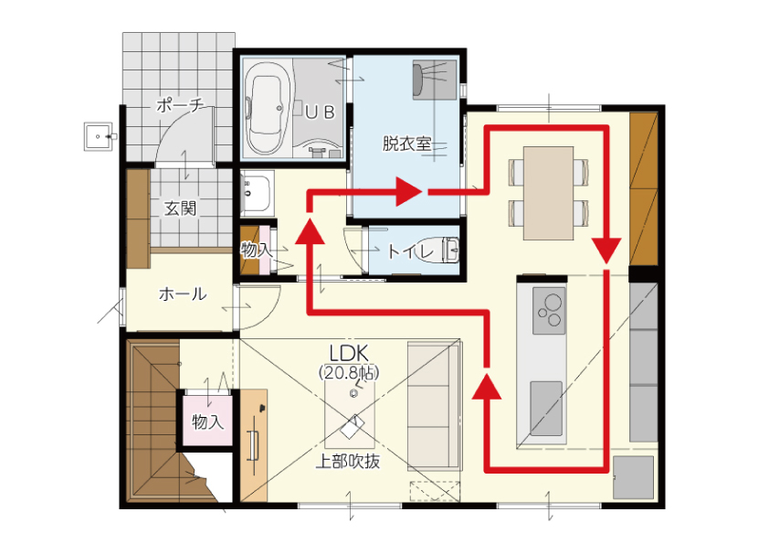 ぐるっと回遊できる動線で、家事ラクラク&時短生活♪- リビング➡洗面➡脱衣室(ランドリールーム)➡ダイニング➡キッチンまで「ぐるっと回遊できる動線」で、家事効率がアップ♪