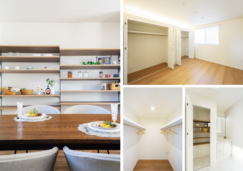 見せても隠してもOK!豊富な収納で、広々快適な暮らしを実現♪- 「見せる収納」や「家族で使えるファミクロ」など収納も豊富!家の中が散らからず、広々とした空間で快適に暮らすことができます。また、家族が増えても物が増えても心配ありません。