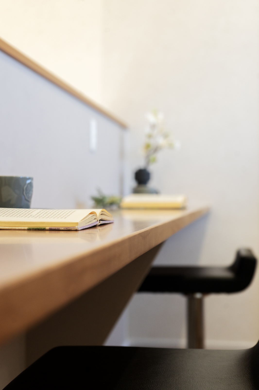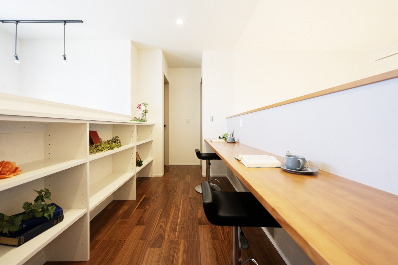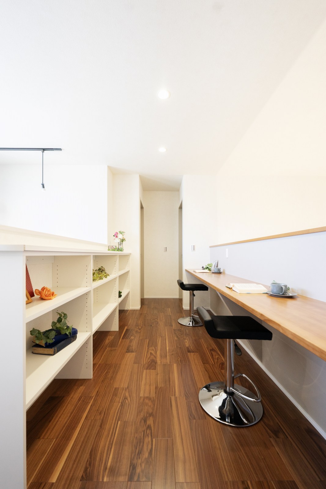 ワークスペース- 2階の吹抜け横は、カウンターを設置してワークスペースに。背面には便利な収納も。
