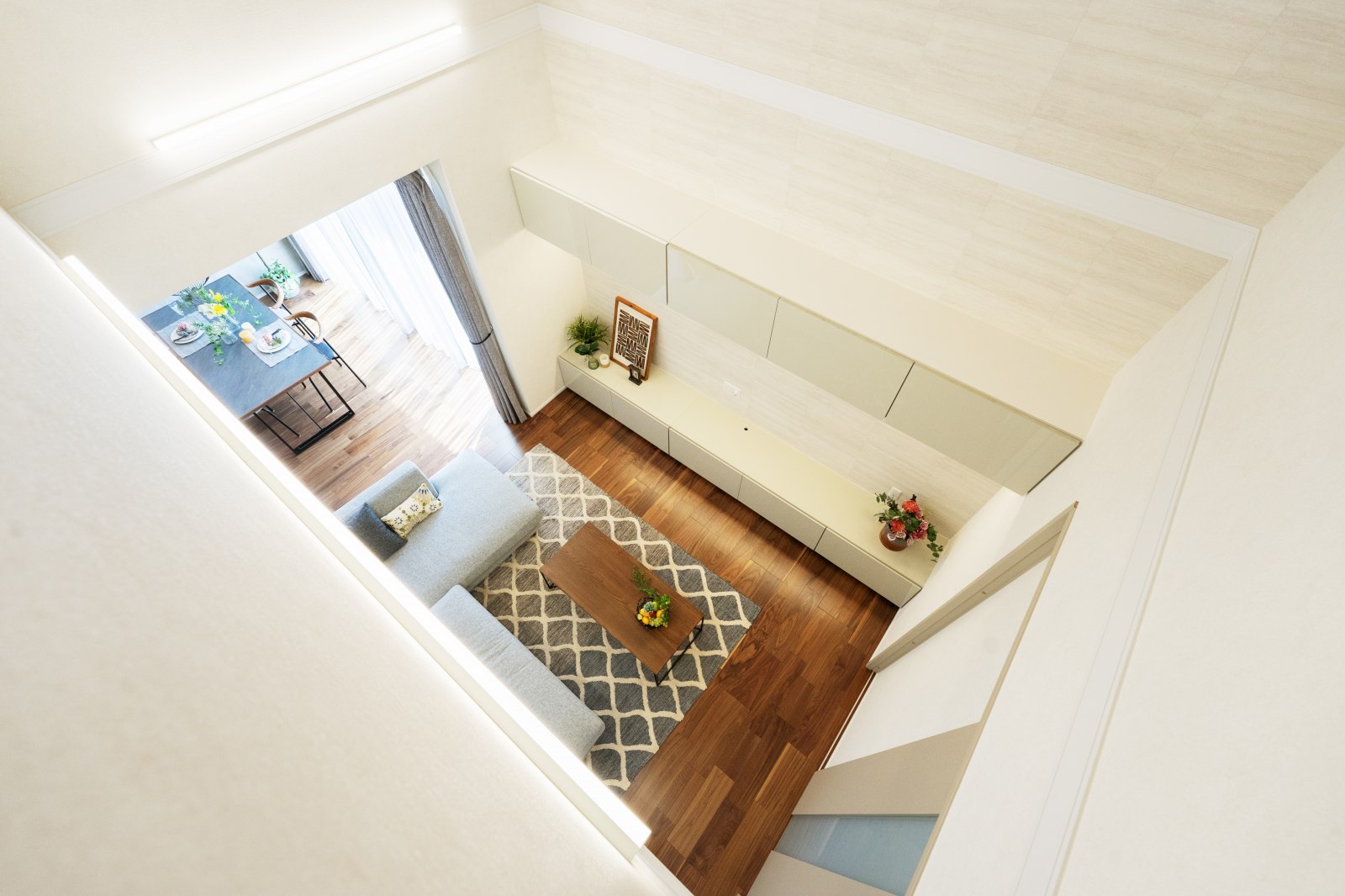 LDK- 22帖のLDKは圧巻の開放感!リビング上部は吹抜けで、ダイニングの南側には大きな窓付き!