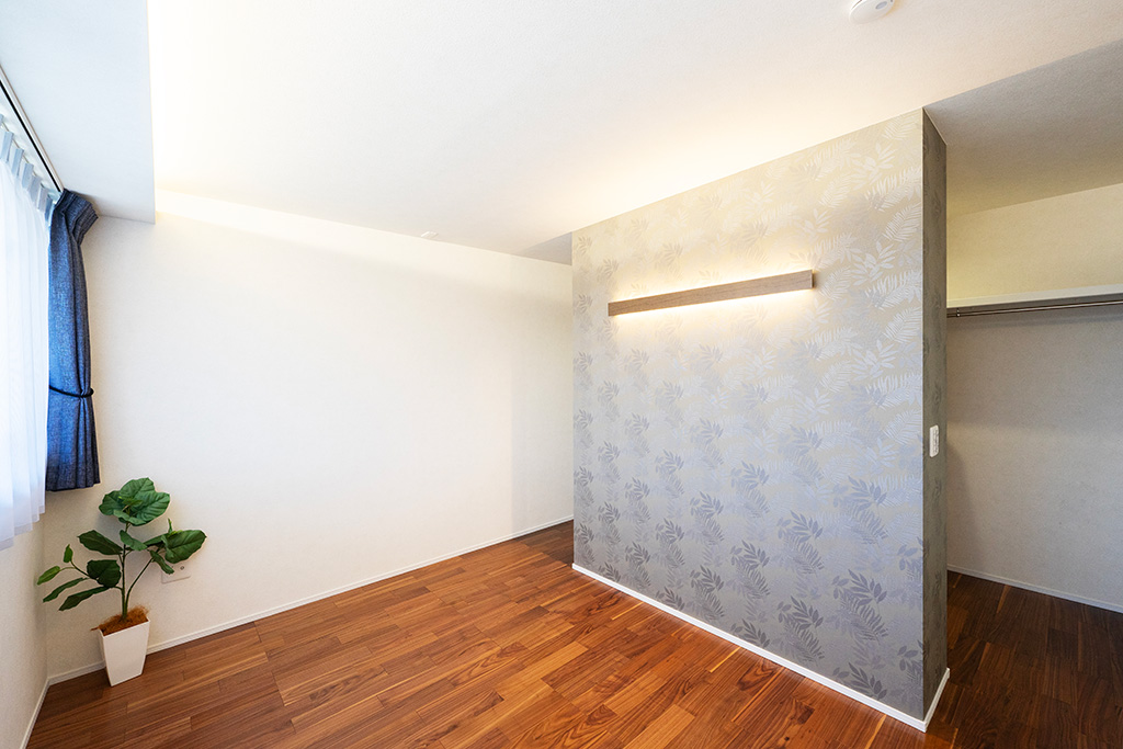 主寝室- 2階の主寝室も、南側に大きな窓付きの開放的な空間!室内には入口が2か所で物が取り出しやすいウォークスルークローゼット付き!