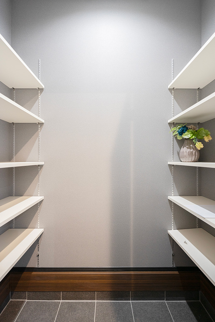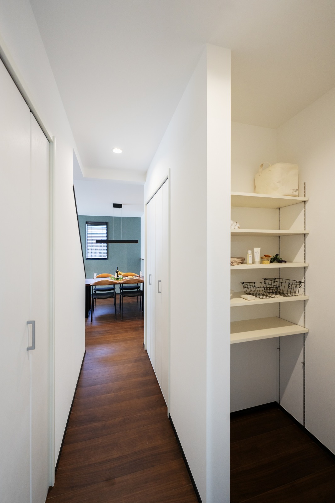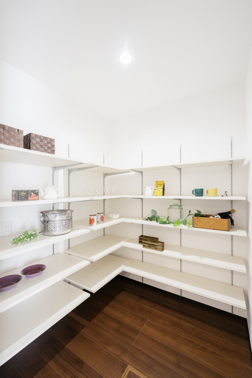 特大パントリー- キッチン近くには大きなパントリー!ホールには2か所も収納があって、室内がスッキリ片付きます!