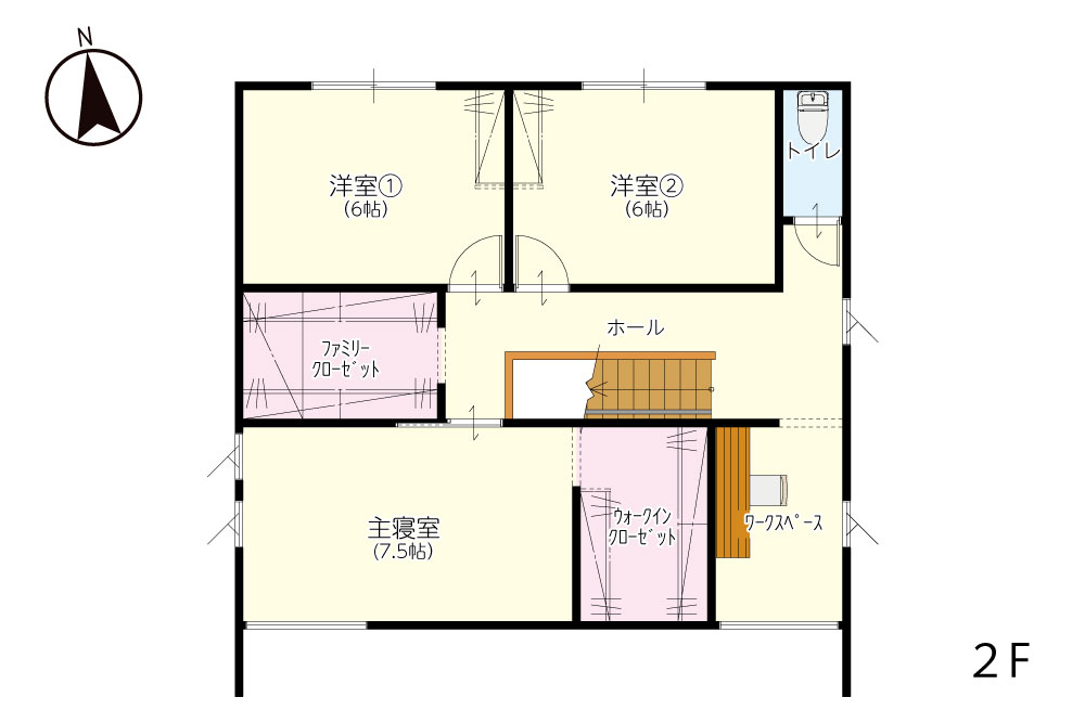 ファミクロ- 2階の階段近くにファミリークローゼット。主寝室のメイン収納として使うだけでなく、洋室に入りきれなかったものまで仕舞える大きさです。