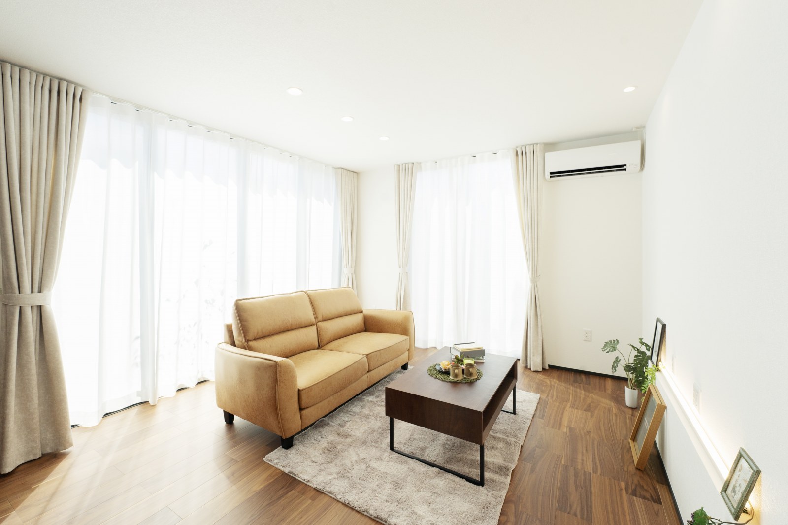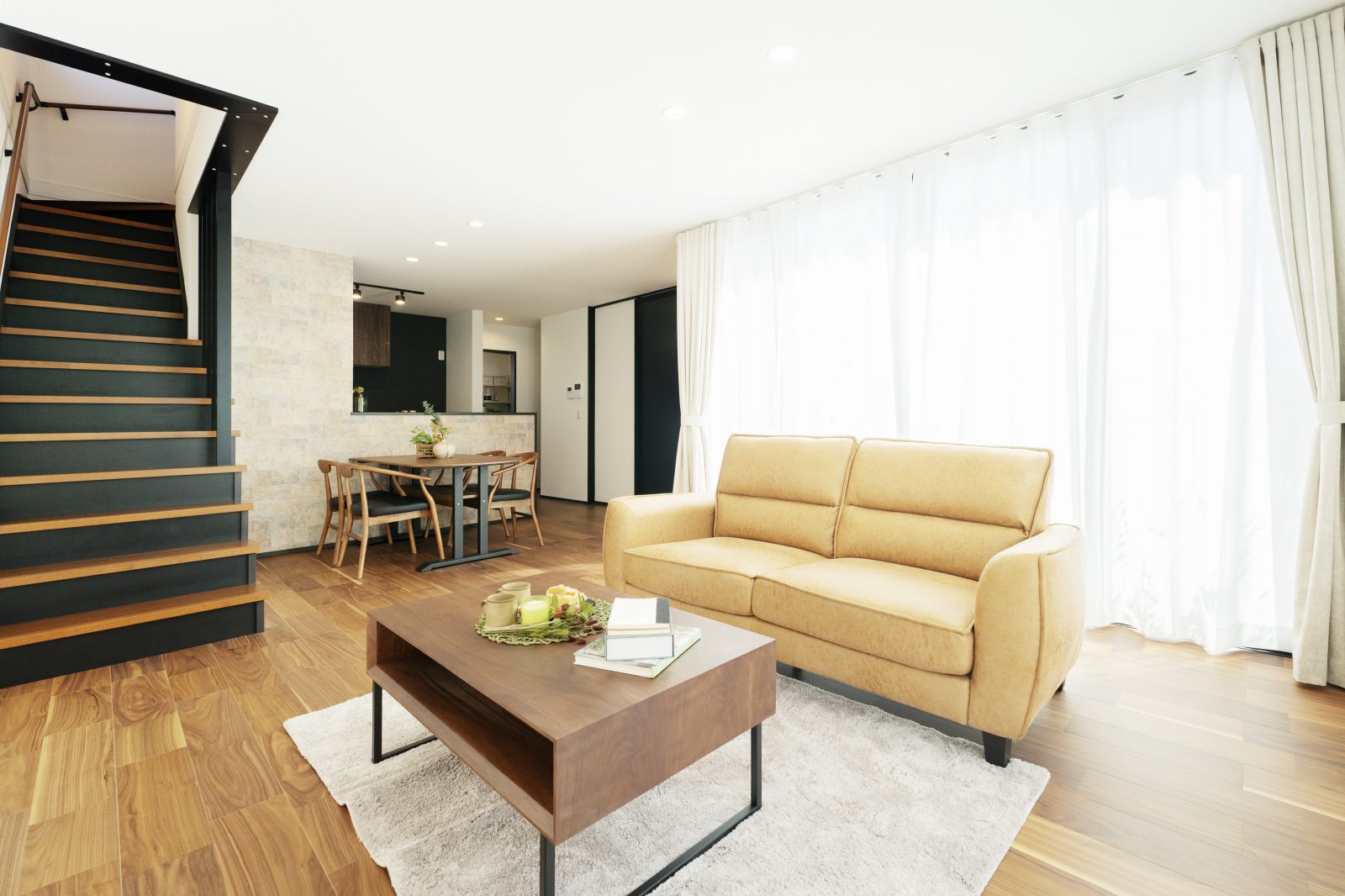リビング- 窓で囲われたリビング。ウェーブスタイルのカーテンから漏れる光が柔らかく差し込みます。お部屋の配色はシックなものに統一して大人な雰囲気に。