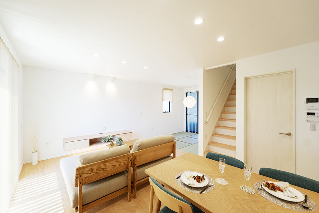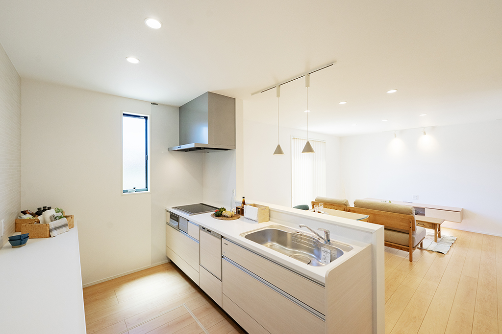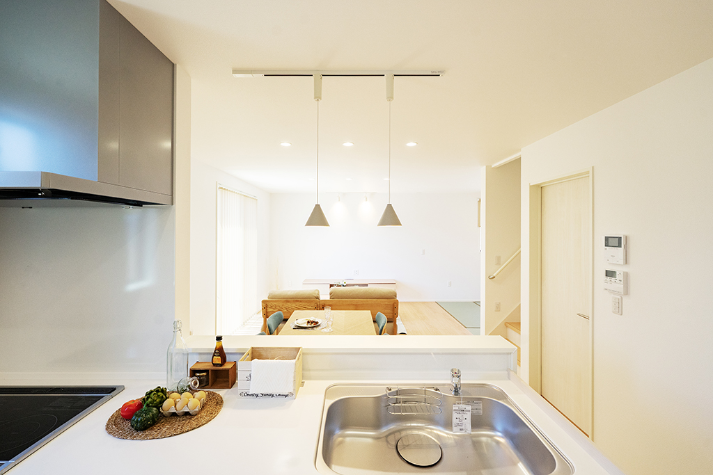 コンパクトなのに広く感じる、開放感あるLDK+水まわり動線- 16帖のLDKは、食事もくつろぎもひとつながりで快適。キッチンからリビング・和室まで見渡せるから、子どもが遊ぶ様子を見守りながら家事ができます。洗面室や浴室も近く、毎日の家事も効率的にこなせるママ目線の工夫が詰まっています。