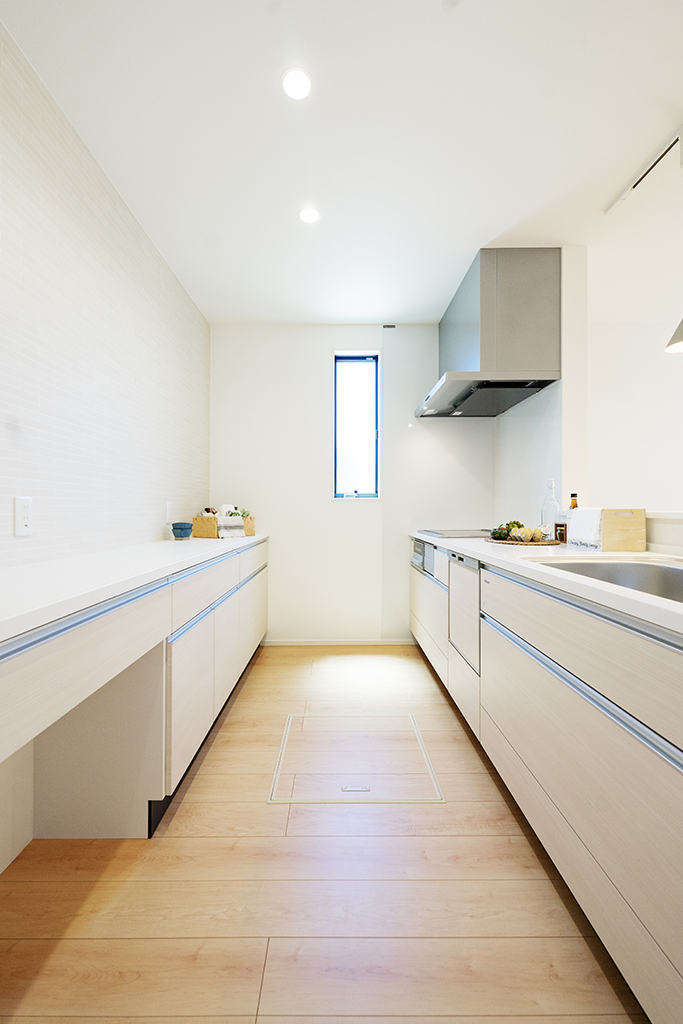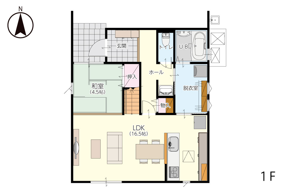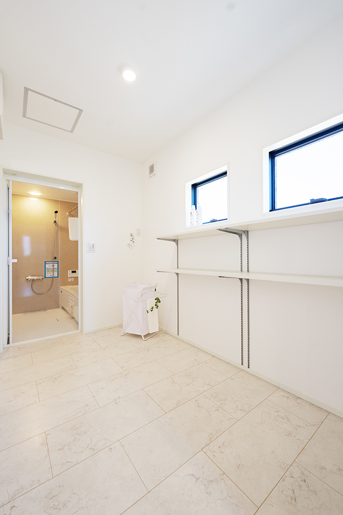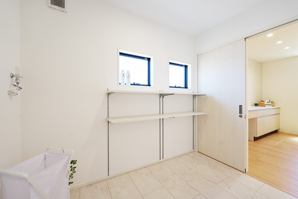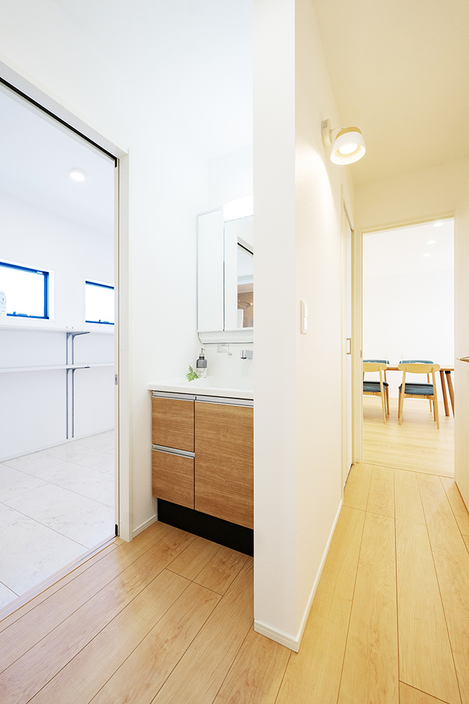 ただいま手洗いができる、家族思いの動線設計- 玄関ホールから直接、洗面脱衣室へアクセス可能。リビングを通らずに「ただいま手洗い」ができるから、ウイルス対策もばっちり。外遊び帰りのお子さまや、将来2人目が生まれたときのおむつ替えにも、快適な動線がうれしいポイントです。