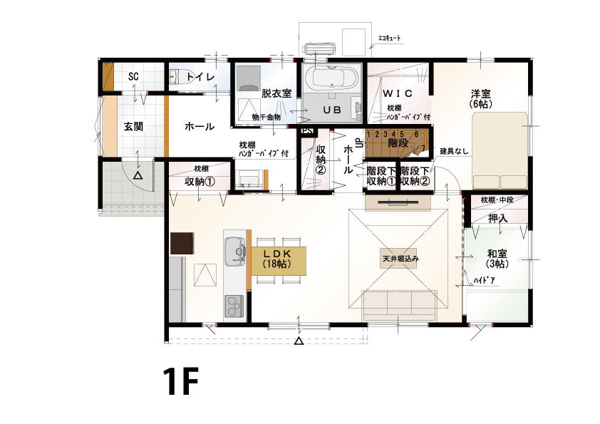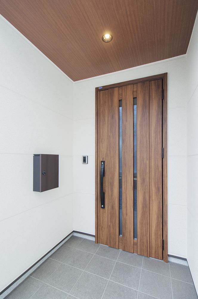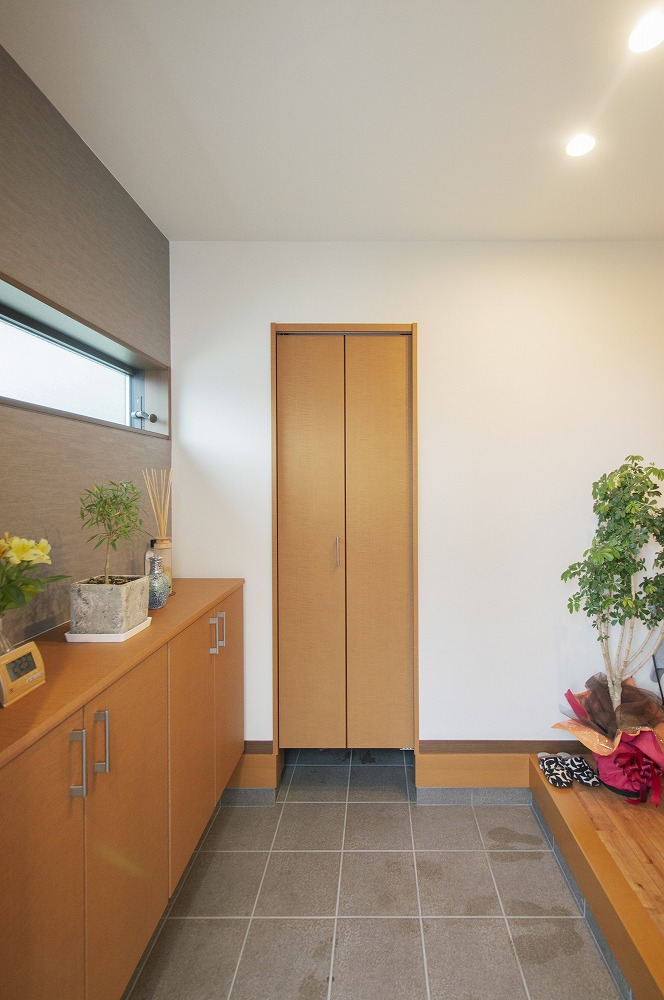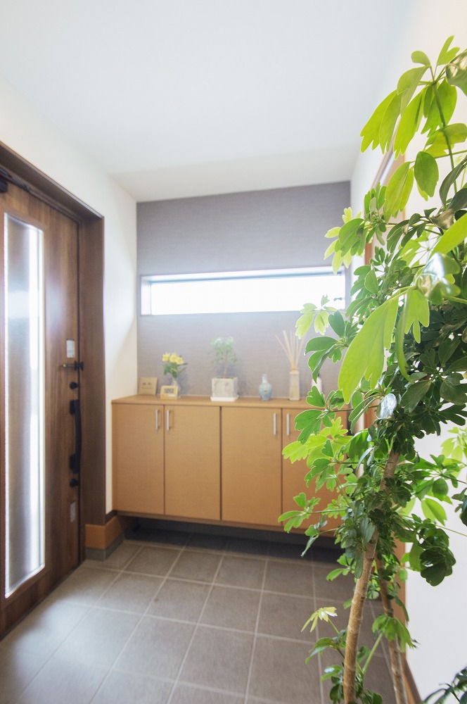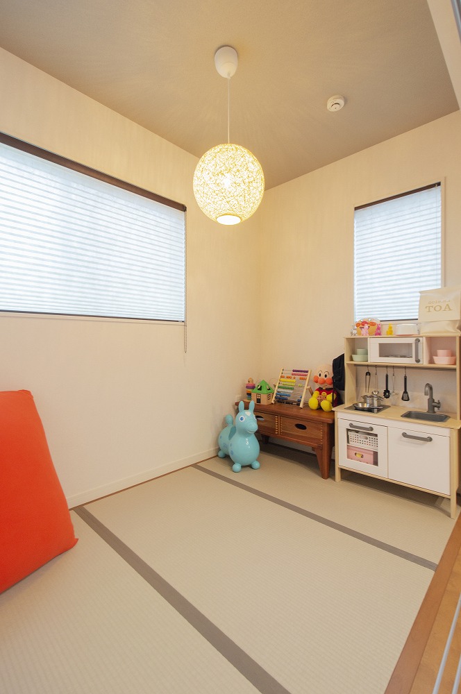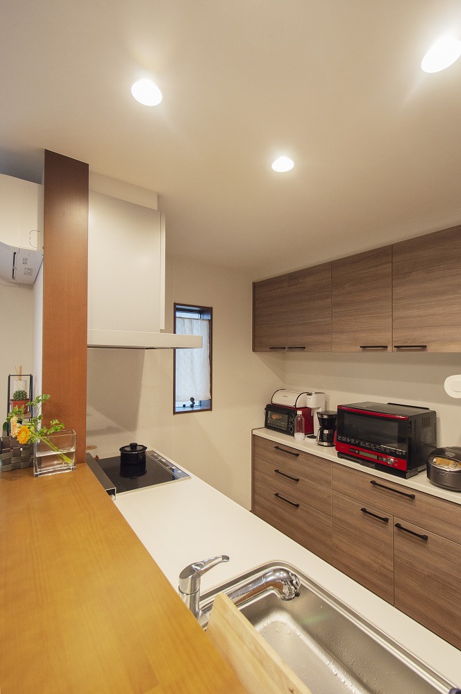 【熊本市東区・34坪】2階建て・5LDK・S様邸 見どころ ①開放感のあるストレートLDK ②脱衣所と分けた洗面台 ③それぞれのお部屋から出られるバルコニー 広さとぬくもりを感じる二世代で暮らす家 【LDK】 とにかく広く見せたいというご要望からLDKをストレートに配置。 天上は木目調のクロスを使用。モダンな雰囲気で居心地の良い空間に。 【洗面台】 脱衣所とは別に配置した洗面台。 ただいま手洗いができ、脱衣所を使用されていても洗面台を使用することができます。