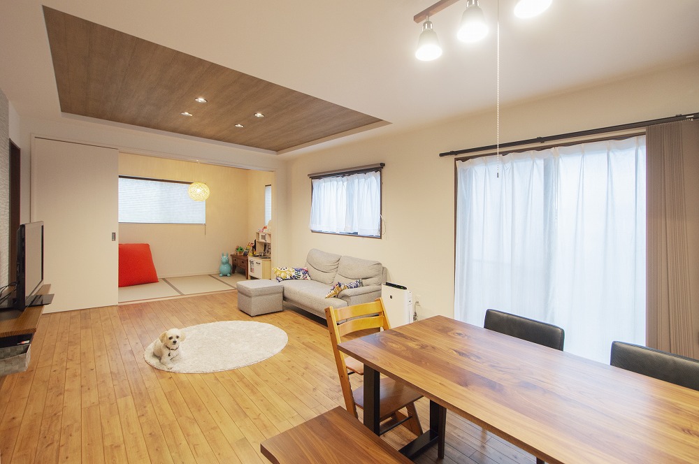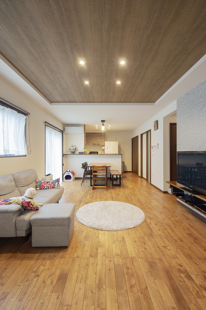 【LDK】 とにかく広く見せたいというご要望からLDKをストレートに配置。 天上は木目調のクロスを使用。モダンな雰囲気で居心地の良い空間に。