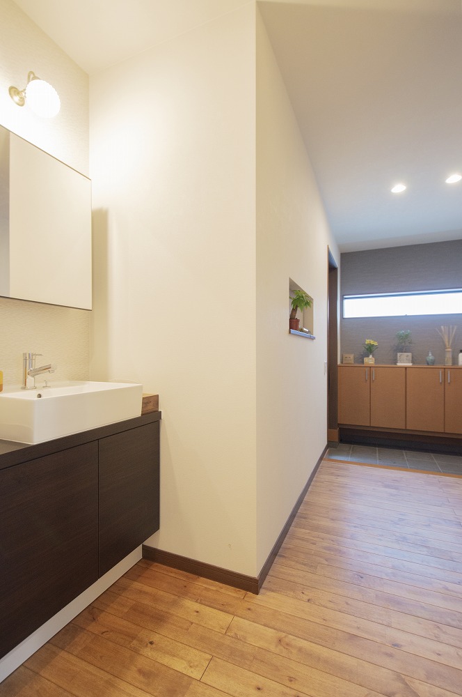 【洗面台】 脱衣所とは別に配置した洗面台。 ただいま手洗いができ、脱衣所を使用されていても洗面台を使用することができます。