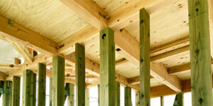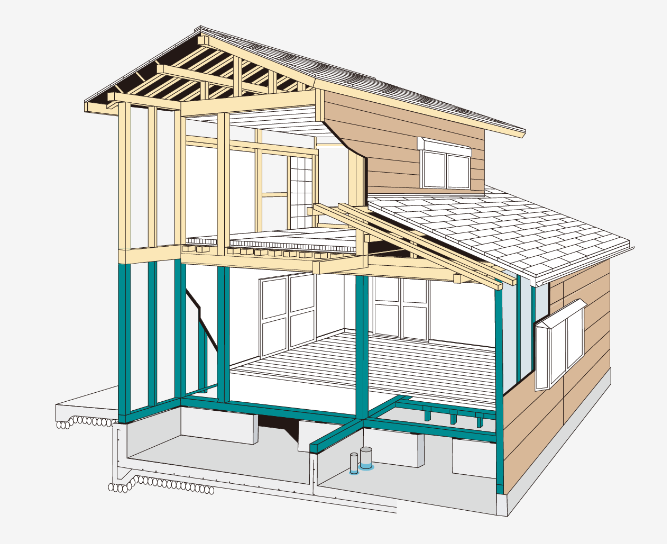 ハウスガードシステムは、耐久性の高い「腐らない木」とも呼ばれる「緑の柱」を住宅の主要構造部材に用いた家づくりシステムで、新築時の耐震性能を長期間にわたって維持することができます。