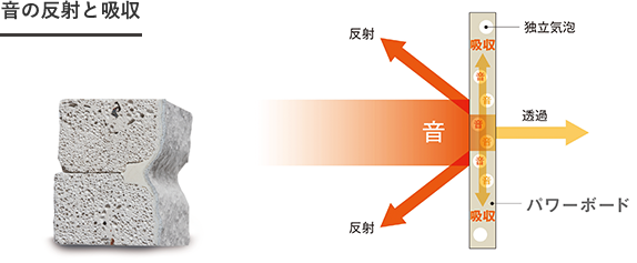 パワーボードは、音の反射が大きく音を通しにくい素材です。さらに壁体内に伝わった音は、37ミリの厚さ内に無数にある独立気泡が吸収するためさらに遮音効果を発揮し、室内への音の侵入を低減します。