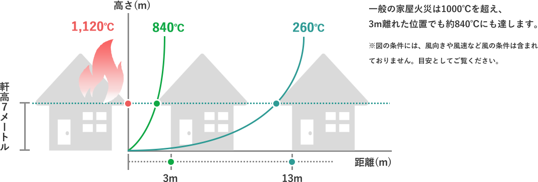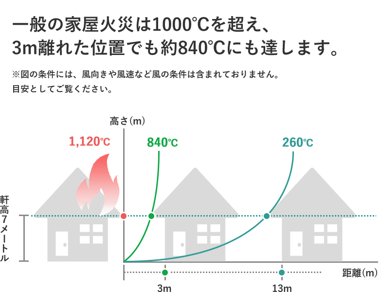 隣家が火災時には、外壁面は800℃以上の高熱にさらされることになります。木材の引火危険温度は約260℃であるため、外壁の内側がその温度に達すると構造体が発火する恐れがあります。ヘーベルパワーボードの場合は外壁が直接炎にさらされても、内側は引火危険温度まで上がりにくく、延焼の危険性を減らすことができます。