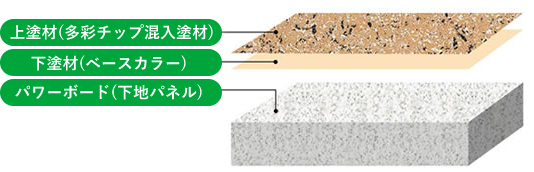 - 下塗材、上塗材(含ゲル材多彩チップ)共に高性能アクリルシリコーン樹脂を主原料とした長期耐久塗材(期待耐久年数20年)です。実際のパワーボード基材を用いて幅広く検証しておりますので、ご安心してお使いいただけます。