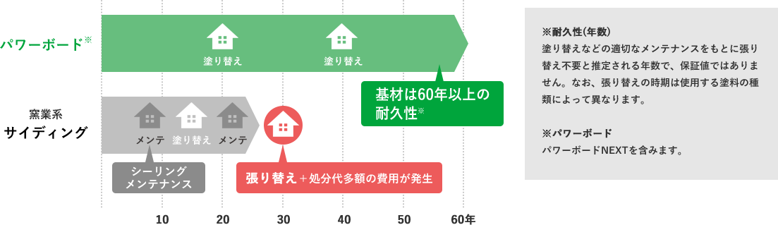 60年以上張替え不要のパワーボードなら塗装の塗替え費用だけで済むのでとても経済的です。
