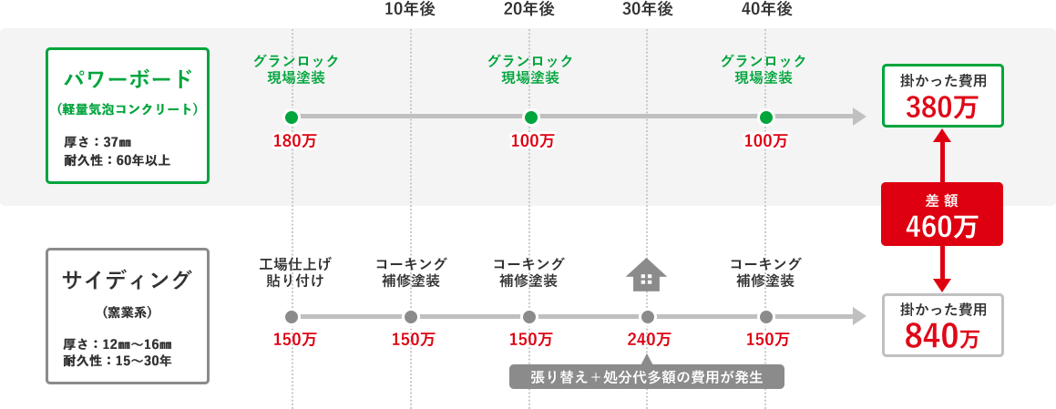 - 外壁は簡単に取り替えが出来ない部分になります。だからこそ長い目で見て考えるならメンテナンスコストは非常に重要です。