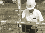 - 基礎の底盤(ベース)部分の配筋検査です。 ベースのコンクリート打設前に鉄筋のピッチ、かぶり厚さ等の検査を行います。また、開口部の幅や適切な補強がされているかなどの チェックも行っています。