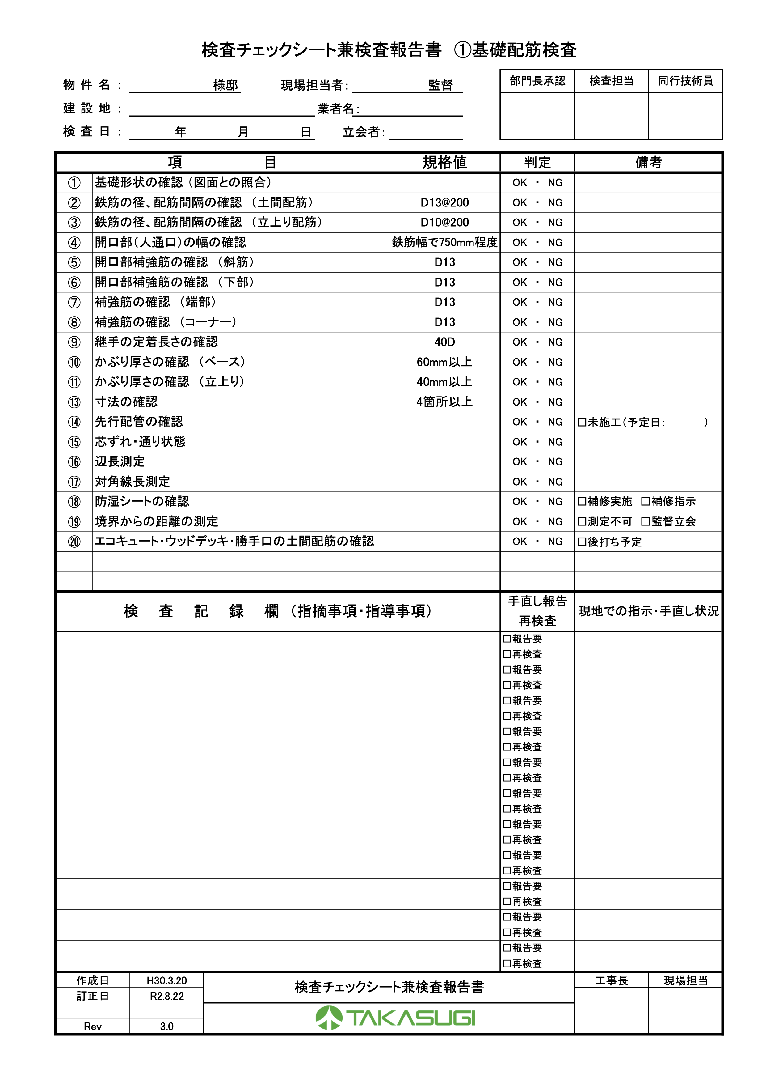 - TAKASUGIは第三者機関である国、県、市、確認申請審査機関による検査に加え、自社の検査機関にてコンクリートや壁の中などに隠れてしまう部分の検査を重視して行っています。指導箇所が発生した場合は、依頼書と報告書を交わすことで伝達ミスを防ぎ一つ一つ確実に修正を行います。