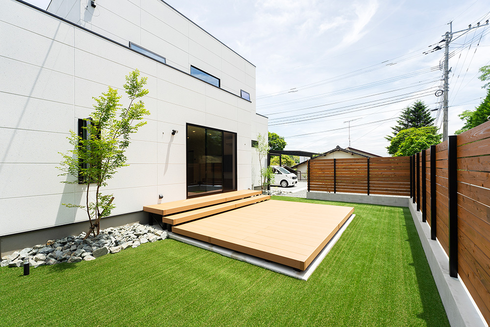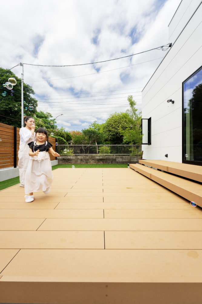 とにかく駐車場やウッドデッキをひろ~くしました!その気になれば友達も10人くらいは呼べますね(笑)