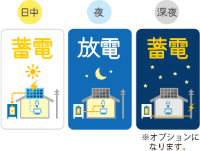 - 昼間発電しいた電気を蓄電し夜に使用。